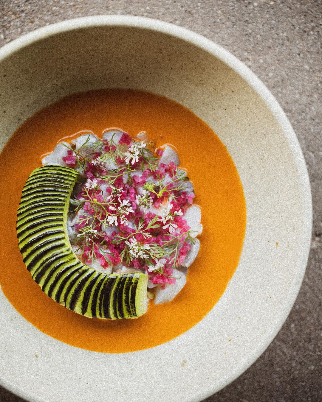 The menu at Carao Riviera Nayarit is inspired by the fresh ingredients and authentic flavors of the region, presented with the innovative touch that characterizes Enrique Olvera’s vision. One of the standout dishes is the Pulpo a las Brasas, where the octopus, carefully marinated and perfectly grilled, is served with a black bean purée and a roasted chili sauce that adds depth of flavor and a perfect balance between spicy and smoky. This dish reflects Carao’s commitment to quality and authenticity, offering diners a culinary experience that is both sophisticated and deeply rooted in Mexican tradition.
